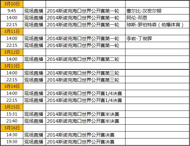 3月10日-3月16日,球迷盼望已久的2014斯诺克海口世界公开赛将于海南国际会议展览中心如期打响。CCTV-5直播表如下: