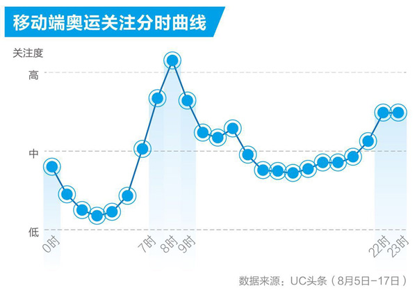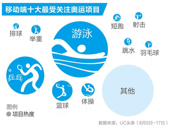 据UC发布的“手机端奥运观战行为报告”分析,游泳、乒乓球和篮球成为最受关注的赛事项目,一天之中奥运阅读最活跃的时段是上班途中和睡觉前。84.6%的奥运关注者是80-00年代出生的年轻人,其中“90后”和“00后”占据半壁江山。