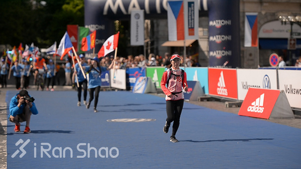 (2016年布拉格马拉松的最后一名,最后几百米,赛事DJ一路陪同,两旁的各国旗手则跟在她身后一同冲线)