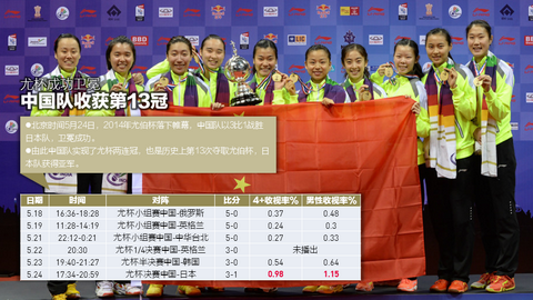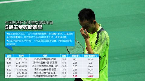 2014年汤尤杯中国男队出局,5冠王梦想破灭;女队顺利卫冕,收获第13冠。