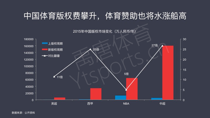 其中,NBA新版权周期的价格对比上个版权周期上涨了五倍,英超上涨了11倍,西甲上涨了25倍,而中超更是上涨了27倍。由此,新媒体也在中国体育产业中扮演起了日益重要的角色,并对传统体育媒体形成了一定的冲击。