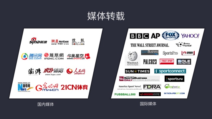我们对一百余位国内外体育产业界的大咖,包括WPP主席、国际篮联主席、国际乒联主席、国际雪联主席、国际足联总监,以及万达、阿里、腾讯的众多高管进行了独家专访,超过150篇稿件被BBC、美联社、雅虎体育、福克斯体育、华尔街日报、中国日报等外媒转载引用,并成为了十多个全球顶级体育论坛中国地区的独家媒体合作伙伴,包括国际体育大会、足球专家全球大会、每日电讯体育商业大会、WFF、WFS等等。