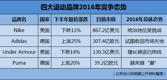 亿邦动力网根据公开资料把Nike、Adidas、Under Armour、Puma四个国际运动品牌在2016年的数据进行了对比分析,力图展现其目前的发展情况和竞争态势。