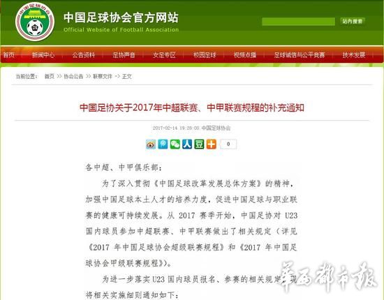 中国足协14日向俱乐部下发中超、中甲U23球员的细则补充通知。在这份《中国足协关于2017年中超联赛、中甲联赛规程的补充通知》中,对U23国内球员报名、参赛的相关规定进行了详细说明: