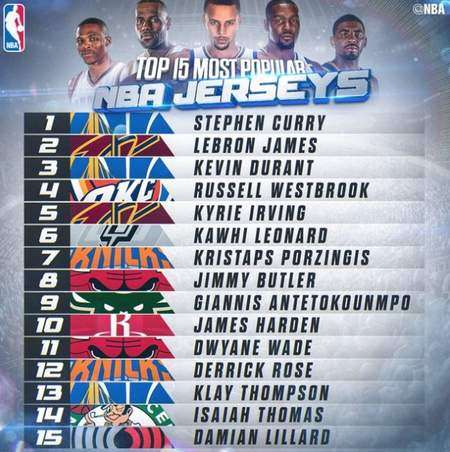 NBA赛季球衣销量前五:库里詹姆斯杜兰特威少欧文