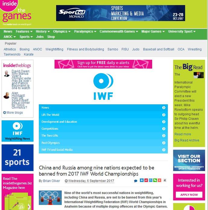 “俄罗斯、中国等9个在举重项目上表现优异的国家预计将被禁止参加2017举重世锦赛”,专注于国际运动赛事报道的英国媒体insidethegames于9月6日发布了以此为题的报道。报道称,俄罗斯、中国、哈萨克斯坦举重队等9个队因奥运会多次“兴奋剂违规”而被禁止参加2017世举重锦赛。