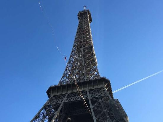 保兰在埃菲尔铁塔进行高空扁带挑战。新华社记者苏斌摄