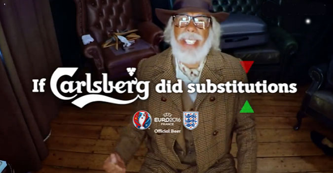 他走在酒吧里,继续发表爱国独白时,伴随着爱国题材的背景音乐,周围充满了看比赛英格兰足球球迷。而在题为“如果嘉士伯做替补”(If Carlsberg Did Substitutions)的广告中,展现了克里斯-卡马拉装扮成一位老人,在伦敦地铁里为给他让座的人提供免费门票。