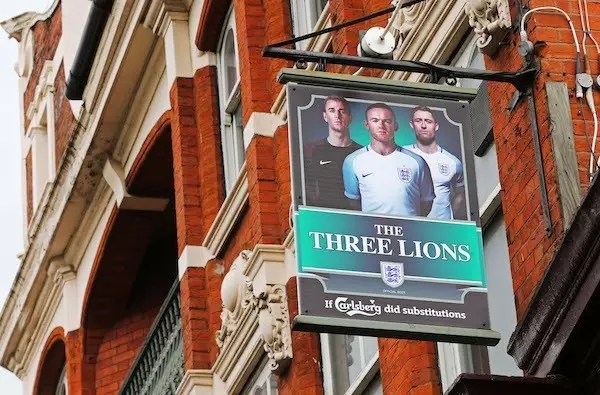 在线下推广方面,嘉士伯着重联合了摊贩和餐饮店的资源,向一万多个酒吧及餐厅发放带有英国球员形象和欧洲杯元素的产品,为球迷营造一个热闹的观赛氛围。值得一提的是,嘉士伯给名字里含有“三”、“狮”元素的酒吧定制了新招牌——三狮军团(The Three Lions),也即英格兰国家队的昵称。与此同时,酒吧对面的墙上,也出现了印有鲁尼、杰米-瓦尔迪和乔-哈特形象的牌子。