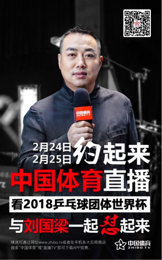 2月24日、25日两天,刘国梁将首次在新媒体平台《中国体育》直播APP(zhibo.tv)解说2018年乒乓球团体世界杯。