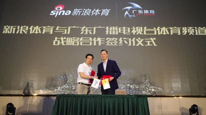 与此同时,新浪体育也与广东广播电视台体育频道达成长期战略伙伴关系,双方将通过多渠道形式丰富的资源共享,融合电视和互联网特性,增进双方媒体内容交流,联合创办新兴IP赛事,开拓广阔的体育市场,提升社会影响力,共同打造国内领先的体育新媒体。