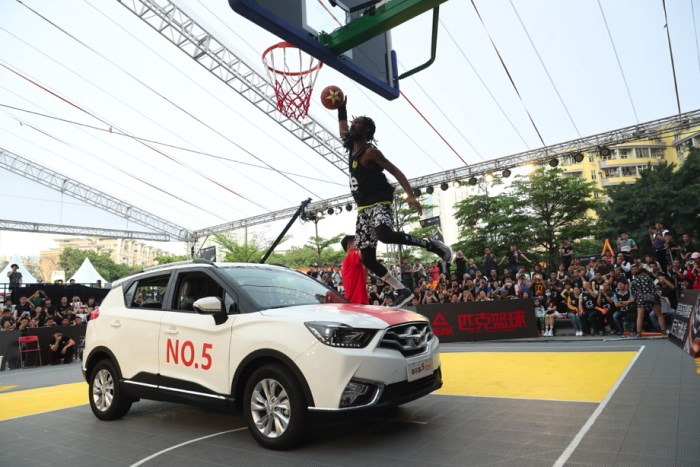 上赛季总决赛中被誉为“世界上跳得最高扣将”的Justin Darlington再度来到3x3黄金联赛现场,在他的邀约之下,“神秘5号球员”正式亮相——海马S5青春版。Justin Darlington借助海马S5汽车施展飞跃汽车的扣篮动作,这一动作瞬间引燃全场气氛。可惜的是,受困于场地原因,Justin Darlington最终未能如愿完成该动作,“青春敢闯”是海马汽车一直秉承的精神和理念,难倒世界级扣将的海马S5青春版将静候更多有识之士的挑战。