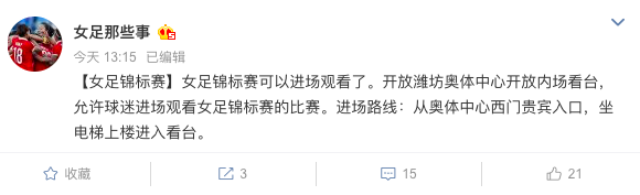 据微博博主女足那些事透露,中国足协同意开放潍坊奥体中心内场看台,供球迷现场观看2018女足锦标赛。该博主在微博中写到:“【女足锦标赛】经过反应问题,中国足协已经同意,潍坊奥体中心开放内场看台,允许球迷进场观看女足锦标赛的比赛。进场路线:从奥体中心西门贵宾入口,坐电梯上楼进入看台。 ”