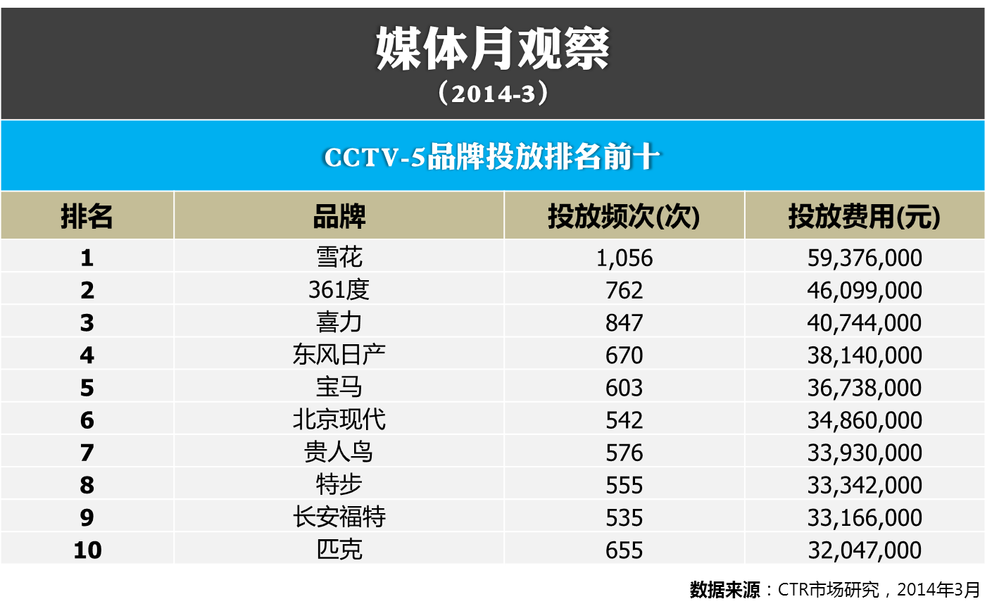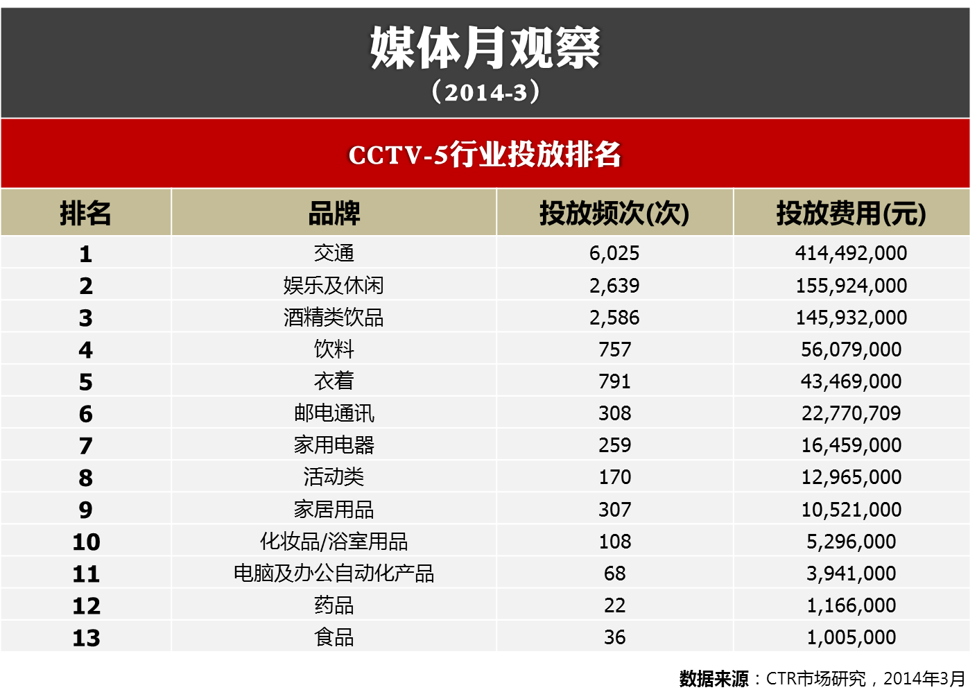 三月行业投放:交通、娱乐及休闲、酒精类饮品排名前三,饮料、衣着紧随其后。雪花、361度、喜力则占据品牌投放前三。