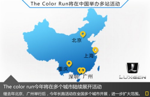 继去年在北京和广州成功举办之后,今年The Color Run长跑赛事将会进一步扩大规模。继3月29日深圳站开跑后,之后将在重庆、北京、上海等8大城市陆续展开,时间跨度长达8个月。在这段时间,纳智捷 优6 SUV均将作为引领车,出现在The Color Run的活动现场与比赛中。对于纳智捷而言,这段时间正是纳智捷 优6 SUV从亮相到上市最关键阶段,因此这无疑将起到很好的营销。