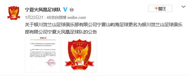 北京时间1月23日,昨日晚,中乙球队宁夏山屿海足球队官方宣布球队正式更名为宁夏火凤凰足球队,队徽更换为火凤凰图腾。在官方公告中,宁夏火凤凰队写道:“因自身发展需要,球队现完成更名,力求在已有的基础上更进一步,更好地推动宁夏足球的发展。”