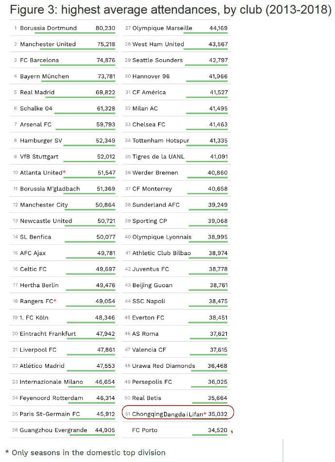 足坛近五年上座人数榜单:恒大等三家中国俱乐部进前60