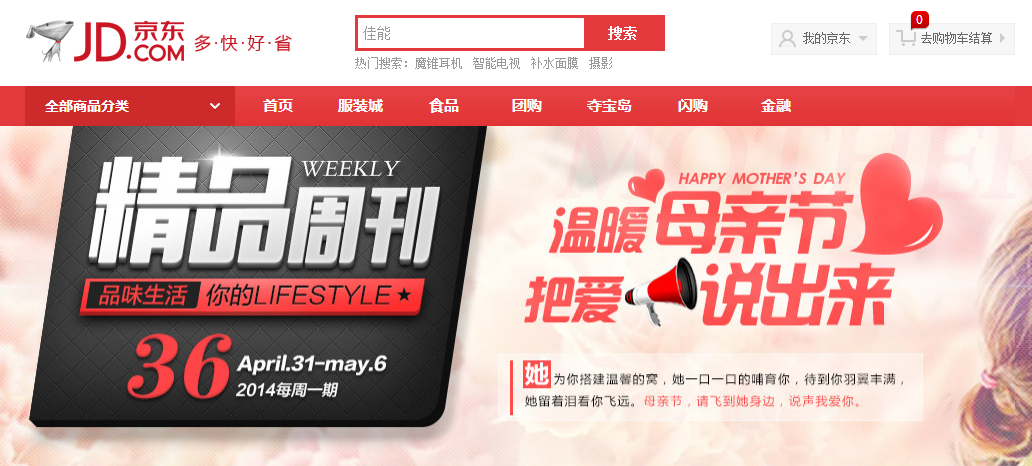 京东商城近期在节日营销上亦是嗅觉灵敏,动作迅速。。老对手――淘宝还没有什么大动作,京东商城却已推出母亲节专区,吃的、用的、穿的、戴的,全方位打造母亲节礼物解决方案。