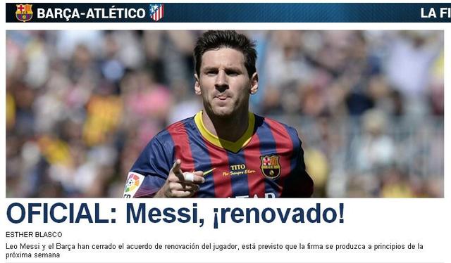鉴于西甲联赛的“决赛”VS马竞大战将至,巴萨官方率先放出梅西续约消息有提振士气的作用,具体合同签订要等到联赛收官之后。加泰罗尼亚媒体《每日体育报》打出大标题:“官方宣布:梅西续约”,巴萨喉舌称:“梅西和巴萨在续约问题上已经达成一致,俱乐部将以世界第一年薪续签这位世界上最好的球员。阿根廷球星将以年薪2000万欧元高价续签合同,其违约金仍为2亿欧元,而合同期将由2018年夏天延长至2019年夏天,而球队引援、目标等五大要素也将写入合同。”