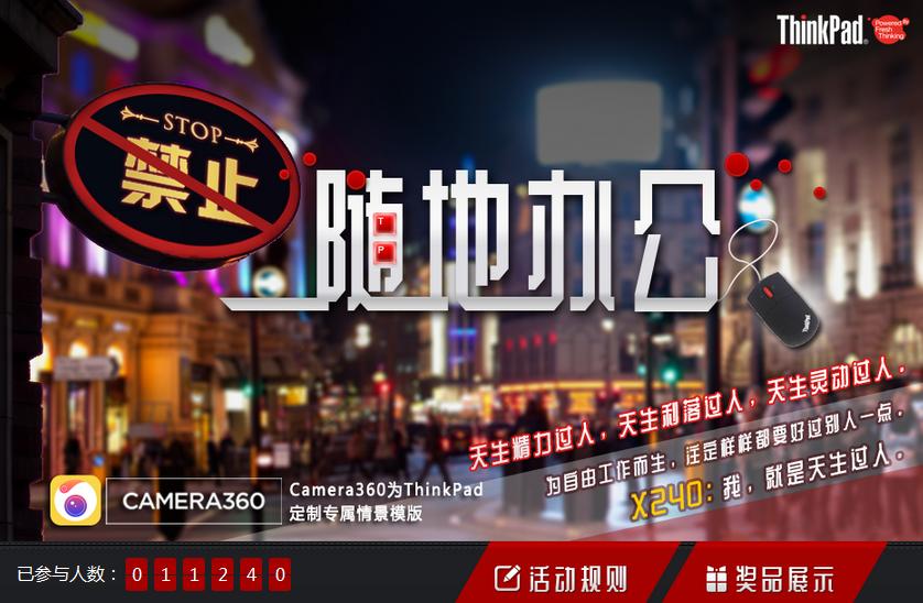 在消费者对新品有了一定的认知的基础上,ThinkPad紧接着推出了“禁止随地办公”的微博活动。并通过和Camera360合作,设计专属情景模板,吸引喜欢拍照的用户,扩大了产品主题的覆盖人群。正话反说,突出X240、X240s才是能够让受众尽情随地办公的商务利器。