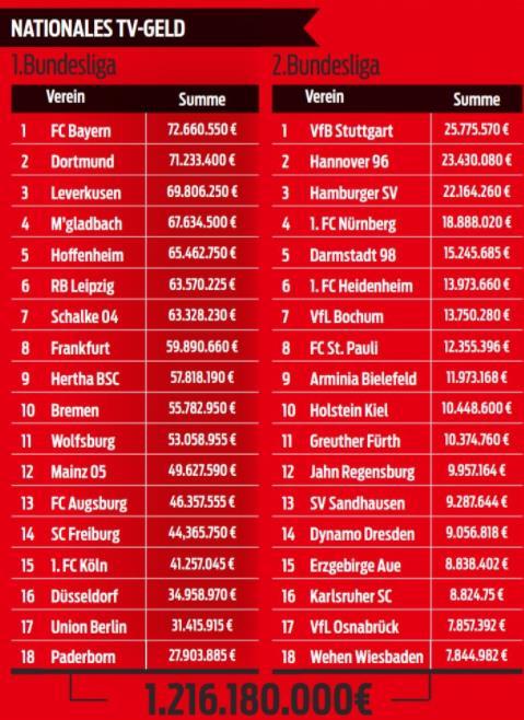 《体育图片报》日前曝光了德甲和德乙联赛36支球队新赛季的电视转播收入分成,36支球队的转播收入总额达到了12.1618亿欧。德甲方面,拜仁收入最高,达到了7266万欧,多特蒙德其次,分到7123万欧,排名垫底的帕德博恩分到2790万欧。德乙方面,斯图加特收入最高,达到了2577万欧,垫底的威斯巴登分到784万欧。