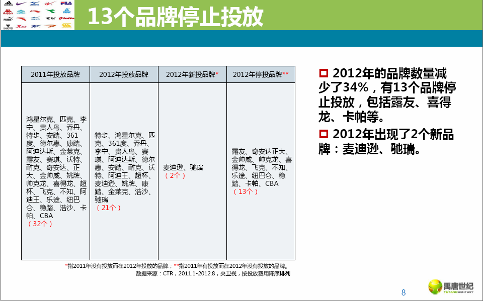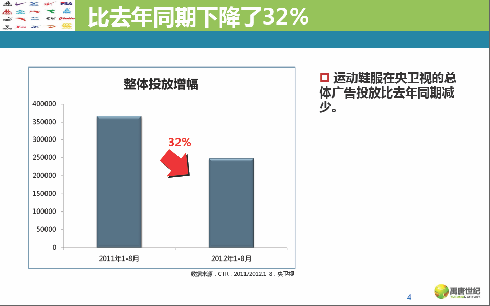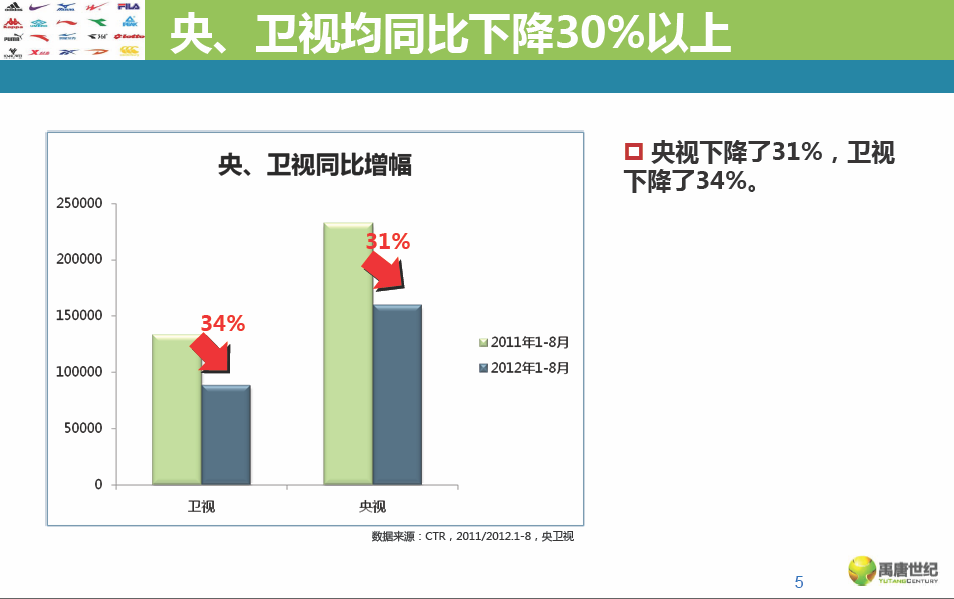 运动鞋服的投放比去年同期下降了三分之一,央、卫视同比降幅均达到30%,品牌数量也减少了34%。