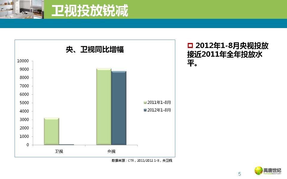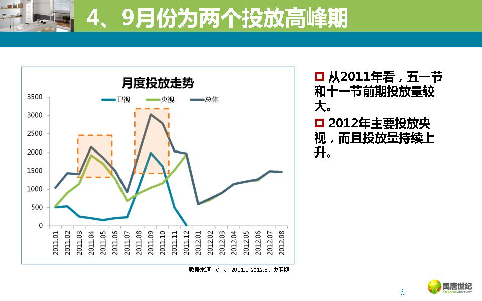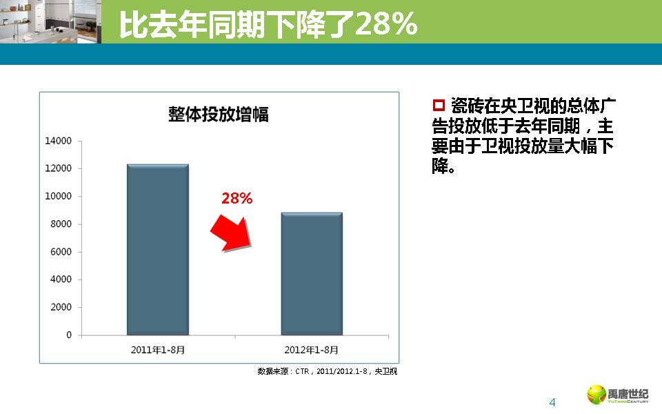 瓷砖在央卫视的总体广告投放低于去年同期,主要由于卫视投放量大幅下降,2012年央视的投放量持续上升。