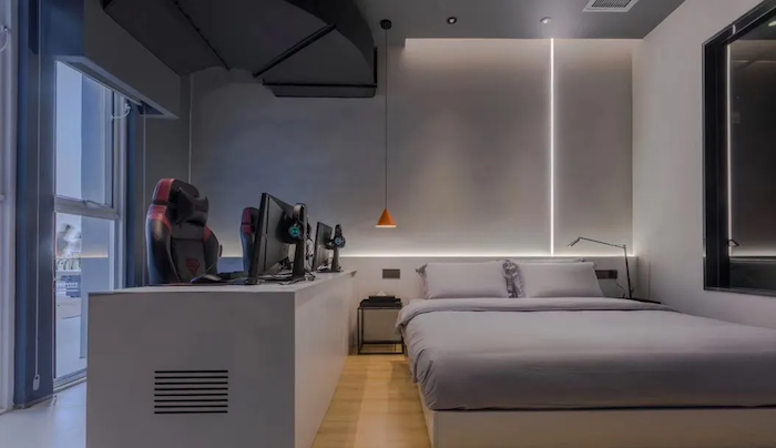 最常见的情形是,酒店老板会从一家即将关门的网吧,或是从二手市场,耗资几十万购置一批高配置电脑,然后安放在现有的客房中,接着打造出专门的电竞单人间、双人间、团战三人间等主题客房。