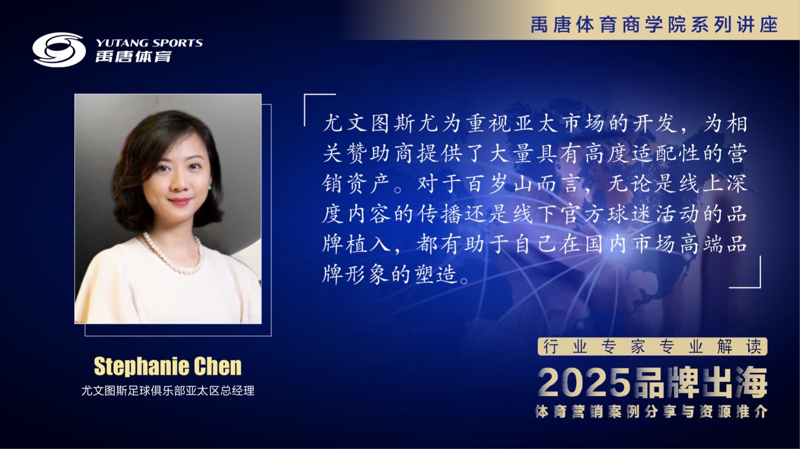 1月份,禹唐体育商学院以线上直播的形式举办了“2025品牌出海体育营销案例分享与资源推介”直播专场,其中特别邀请了尤文图斯足球俱乐部亚太区总经理Stephanie Chen进行相关话题讨论。Stephanie分享了双方合作的成功秘诀。