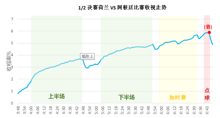 7月10日凌晨4点,荷兰与阿根廷之间的半决赛打响,荷兰在最后的点球大战中惜败,阿根廷在时隔24年之后再度杀进决赛。当日CCTV-5频道份额为6.93%,位列所有上星频道之首。