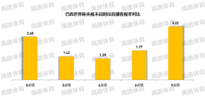因为时差原因,本届世界杯转播时间集中在0点以后,甚至到3点和4点,这大大影响了本届世界杯的收视表现,此外还受到新媒体的分流,本届世界杯赛事直播(含CCTV1/5/5+)并机平均收视为1.9%,收视份额为39.36%,对比南非世界杯直播(含CCTV-1/5/7)并机平均收视3.68%,整体下降了近50%。