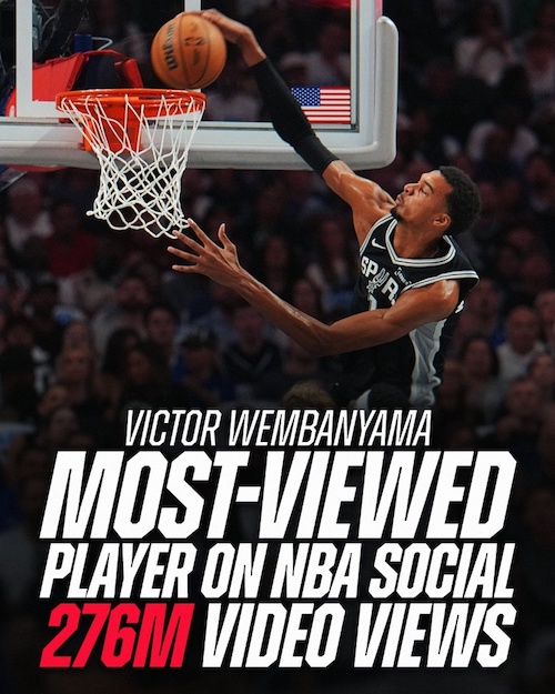 文班亚马在NBA社媒中的视频观看总量达2.76亿次