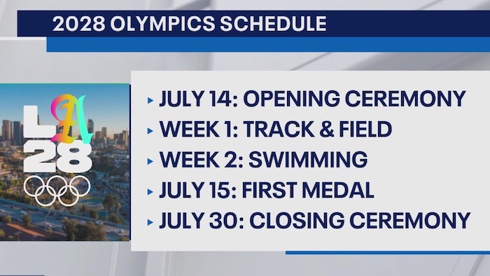 洛杉矶奥组委公布了2028年洛杉矶奥运会全部比赛项目的详细比赛时间,确定了首枚金牌将出自铁人三项女子个人赛,金牌将于北京时间7月16日凌晨1:10分左右在洛杉矶威尼斯海滩产生。此外,相比每届奥运会,田径赛程被提前,游泳项目后移。本届奥运会最后一金将是游泳女子4x100米混合泳接力,将在北京时间7月31日7:30左右诞生。