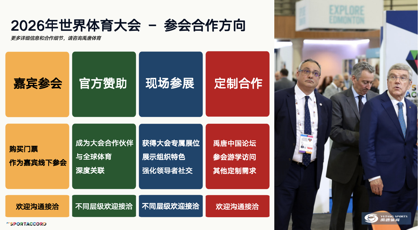 对于参与世界体育大会有明确意向的伙伴,能够从嘉宾参会、峰会官方赞助、峰会参展商、禹唐中国论坛发言等角度切入。