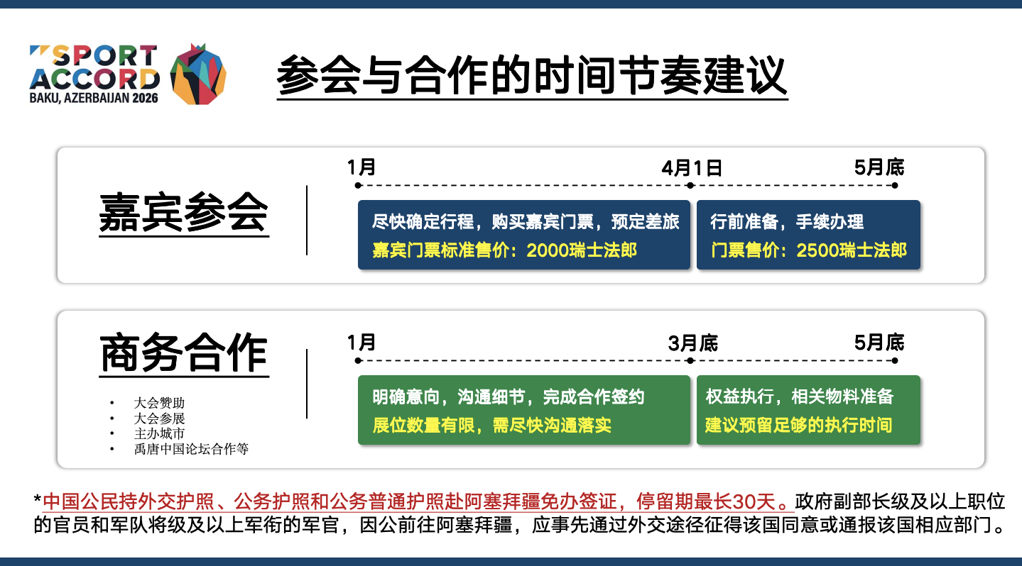 禹唐建议,无论以嘉宾参会还是商务合作的方式参与2026世界体育大会,都应该尽早明确意向,确定行程,为相关手续的落实和具体权益执行留足时间。