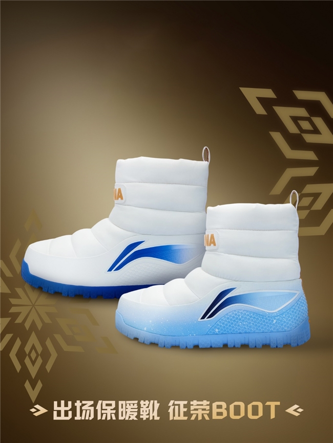 征荣BOOT 以冰穹蓝和雪山白为主配色,与出场服、裤子色调浑然一体,更彰显中国运动健儿昂扬向上的精神风貌。