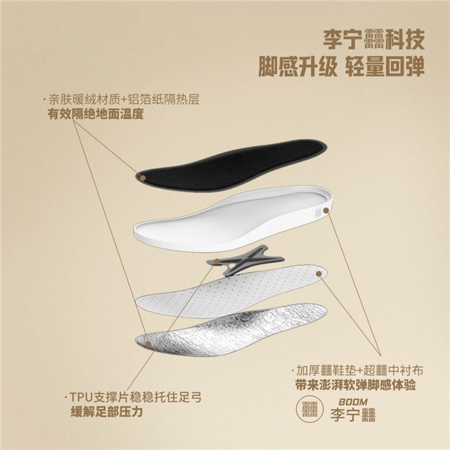 鞋面选用强韧耐磨材料,并经过防泼水处理,既能抵御轻降雨和潮湿环境侵袭,也能保持优异的透气性;鞋垫与内里采用亲肤暖绒材质,一体化鞋垫中底搭载李宁“超䨻”科技,在保障支撑稳定性的基础上,大幅提升回弹表现与穿着舒适度,并同时在中底布下层搭配铝箔纸隔热层,有效隔绝地面低温;鞋大底核心受力区应用了领先的冰面止滑科技,同时局部搭载感温变色橡胶材质,提供可视化功能体验,带来出色的冰面防滑抓地力,全面保障冬季复杂环境下的行走安全。