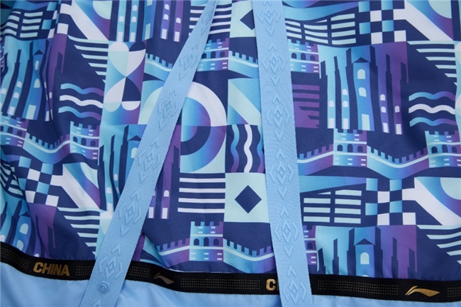 李宁为中国体育代表团打造的系列装备,以承载中国传统吉祥寓意纹样“双胜纹”为核心设计元素,该元素贯穿使用于室外领奖服、室内领奖服以及出场装备全线产品。在出场装备上,两个菱形交叠穿插而成,蕴含着胜利、祥瑞、同心共赢的美好寓意,应用于拉链、袖口、充绒绗线及女款出场服腰带等细节部位。在“双胜纹”基础上衍生出的“双胜雪花纹”,则运用于后幅“CHINA”字母纹饰,以复合工艺将反光材料融入印花,细腻的材料勾勒出双胜雪花纹样交叠,在反光材料的映衬下渐次绽开。