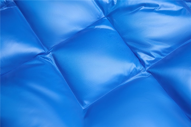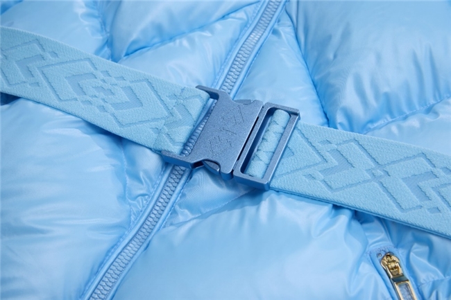 面料采用科技感轻薄材料,触感亲肤细腻,呈现柔和珠光质感,光泽随形流动,整体达到极致轻量化。为满足冰雪运动场温度低、湿度大等自然环境挑战带来的极致保暖性要求,填充物采用高蓬松度的拒水鹅绒,绒子含量达95%,高效锁温,且具有极强的吸湿透气性能;通过符合人体工学的充绒绗线工艺实现填充物全身稳定均匀分布,并在前胸与后背构建出浮雕般的双胜纹纹样结构。