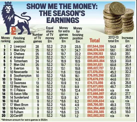 英超各支球队本赛季的转播分成以及奖金(图片出自《邮报》)