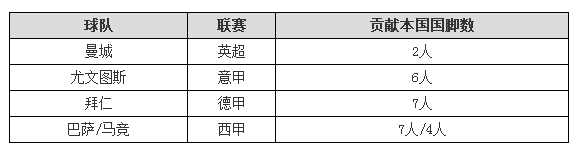 四大联赛冠军对本国的国脚贡献: