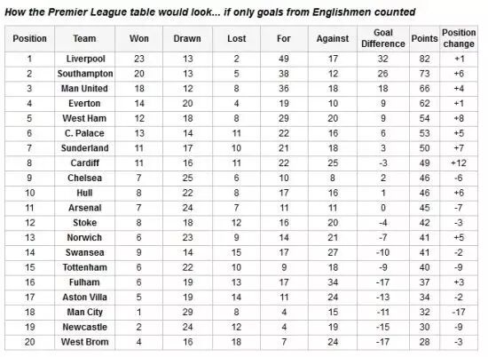 来自《每日邮报》的一项另类统计或许更加可以凸显英超对于英格兰的贡献寥寥,如果在本赛季的英超20强中只计算英格兰人的进球,那么积分榜排名前三位的将是利物浦、南安普敦和曼联,而实际上的冠军曼城在这份另类榜单中会排到倒数第3,切尔西则名列第9,阿森纳只为第11,英超诸强对于外籍球员的依赖程度可见一斑。