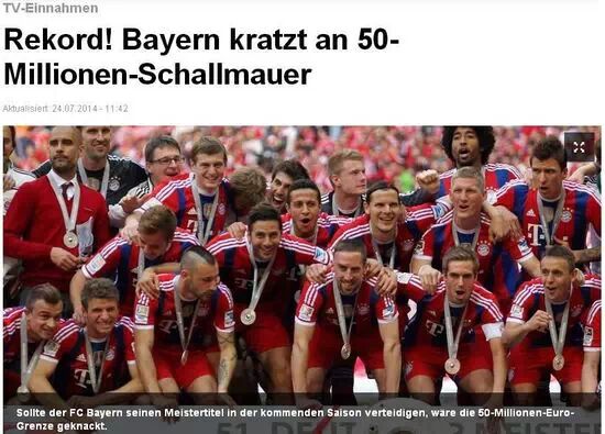 在上赛季的德甲联赛中,拜仁再次获得德甲冠军,而他们在德国足坛转播费排行榜上也牢牢占据着首位。据《踢球者》统计,上赛季拜仁一共获得了4760万欧元的转播费,其中3700万欧元来自于德国国内电视转播,而其余1000余万则来自于其他国家的电视转播。而在新赛季,拜仁还有望创造转播费的新纪录。