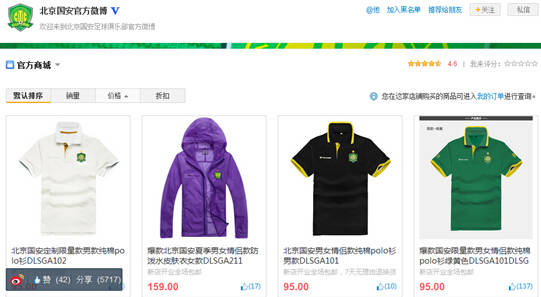 作为中超老牌劲旅,北京国安日前开通了微博商城功能,利用官方微博售卖俱乐部定制服装。这一球场外的大胆尝试,受到了广大国安球迷的热烈追捧。