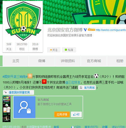 作为中超老牌劲旅,北京国安日前开通了微博商城功能,利用官方微博售卖俱乐部定制服装。这一球场外的大胆尝试,受到了广大国安球迷的热烈追捧。3天时间内,商城内仅有的10件商品成交订单将近500单,已远远超过了同类电商网站相同时段销售成绩的10倍。