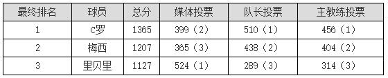如果说2010年的斯内德在媒体投票方面也没有明显优势的话,2013年的里贝里的情况则不同。率领拜仁获得五冠王的法国球星获得了80张第一顺位选票,高于C罗和梅西的总和,总得分也明显领先两大巨星。但在主教练和队长的投票中,梅西和C罗的差距不大,但两人领先里贝里的优势都很大,情况和媒体似乎有明显的不同。2014年,三大团体投出的第一名都是C罗,媒体投票中诺伊尔大幅领先梅西(315分对178分),但队长和主教练投票中的优势让梅西最终排名第二。