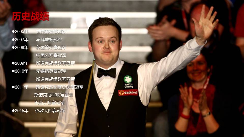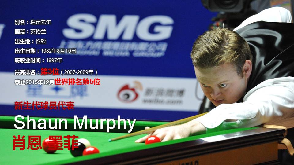 肖恩·墨菲,英格兰职业斯诺克球员,稳定先生,年少时被称为“神童”。2000/2001赛季获得斯诺克年度最佳新人奖,2005年以资格赛选手身份获得世锦赛冠军,2008年又获得英锦赛冠军,成为80后第一个世锦赛英锦赛双料冠军。